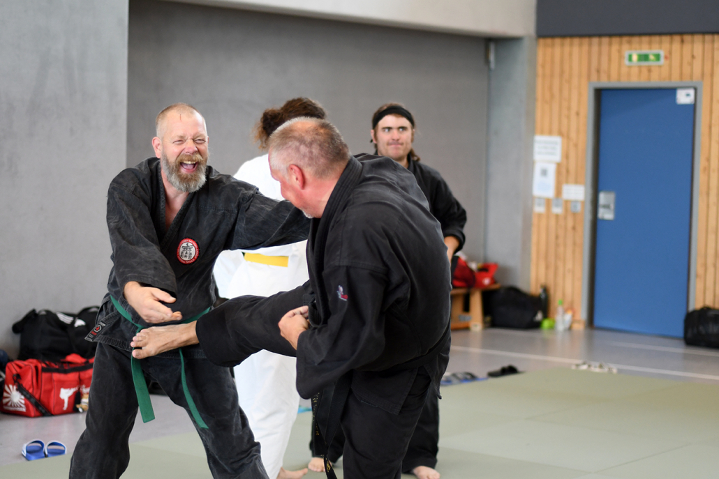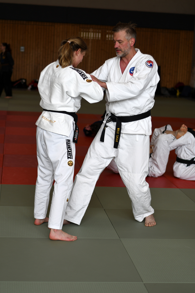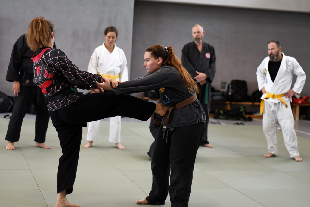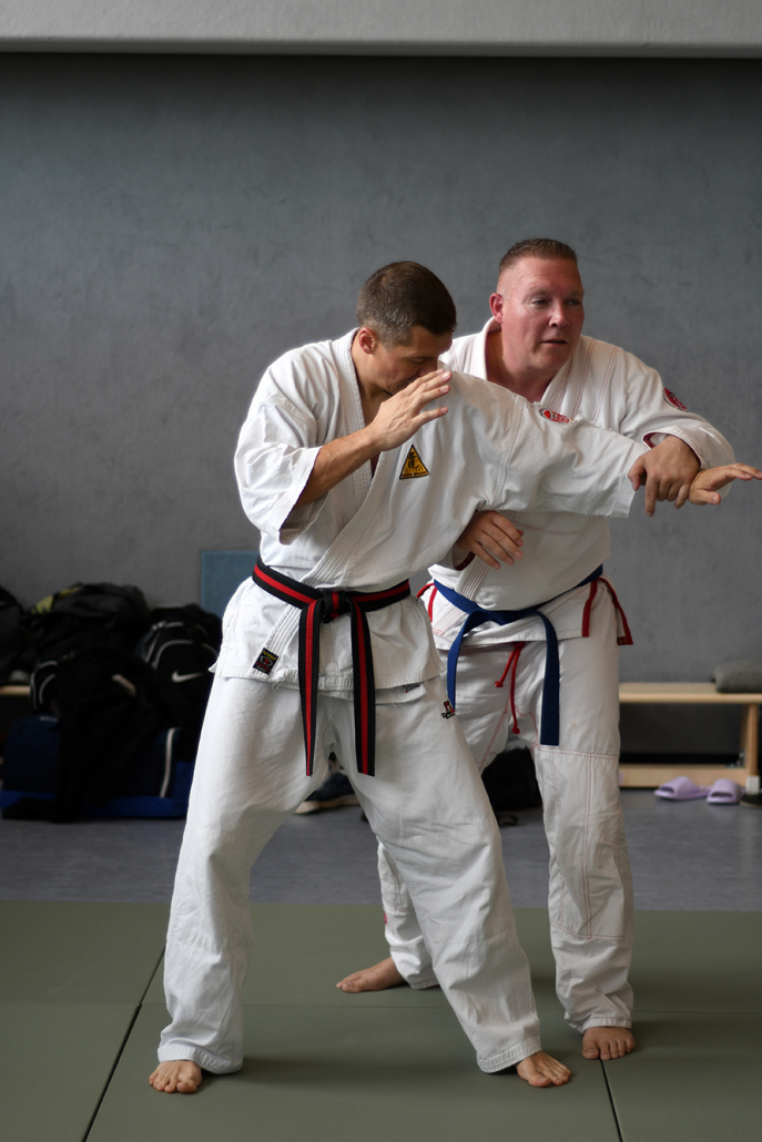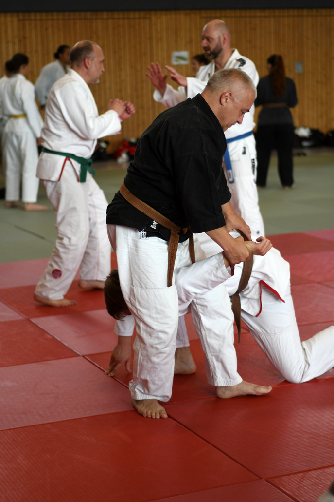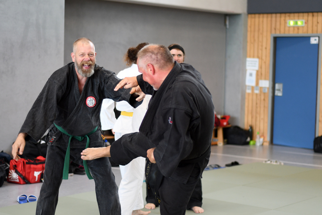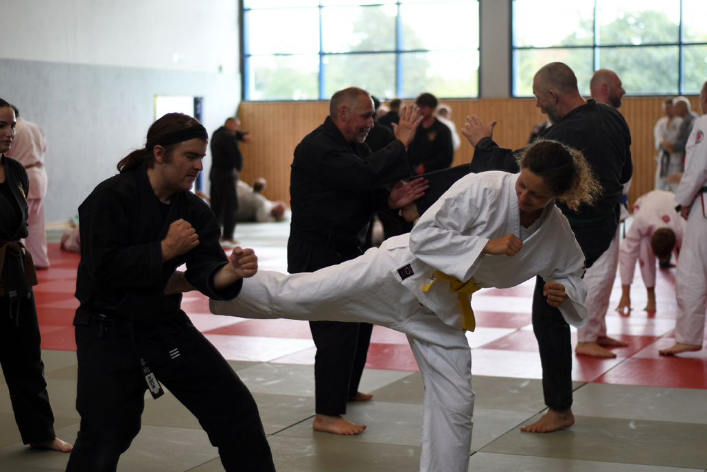 Besonders eindrucksvoll war die Vielfalt der Lehrenden, die mit ihren Hintergründen verschiedene Perspektiven auf das Jiu-Jitsu und verwandte Kampfkünste eröffneten. Achim Hanke, Träger des 9. Dans im Ju Jutsu, vermittelte mit seiner Erfahrung aus mehreren Disziplinen praxisnahe Selbstverteidigung sowohl im Stand als auch am Boden. Alain Sailly aus Frankreich, ebenfalls 9. Dan und Begründer des Goshindo, zeigte fließende Übergänge zwischen waffenlosen Techniken und klassischen Formen des Jiu-Jitsu. Klaus Schmidt, 5. Dan Jiu-Jitsu, brachte Elemente des Modern Arnis in seine Einheiten ein und stellte die Verbindung zwischen traditionellem Training und modernen Bewegungsabläufen her. Janine Poqué, 4. Dan im Hapkido, demonstrierte dynamische Abwehrtechniken mit und ohne Kurzstock, die den Teilnehmenden neue Ansätze für Waffen- und Hebeltechniken eröffneten.