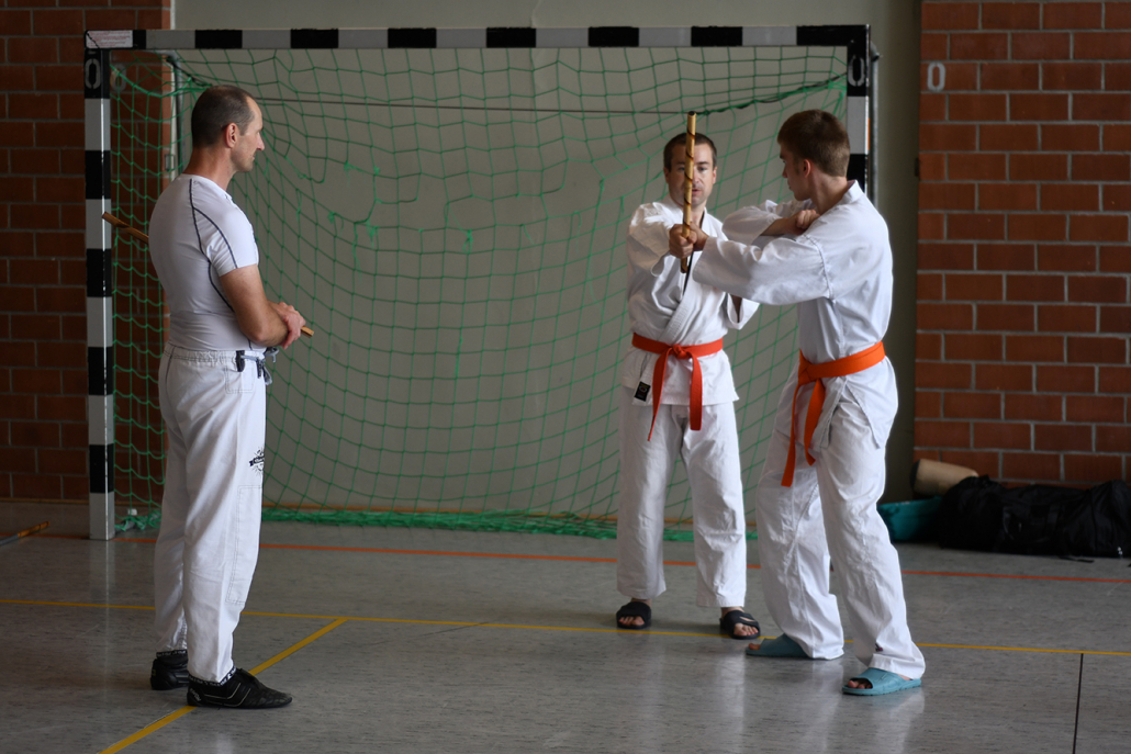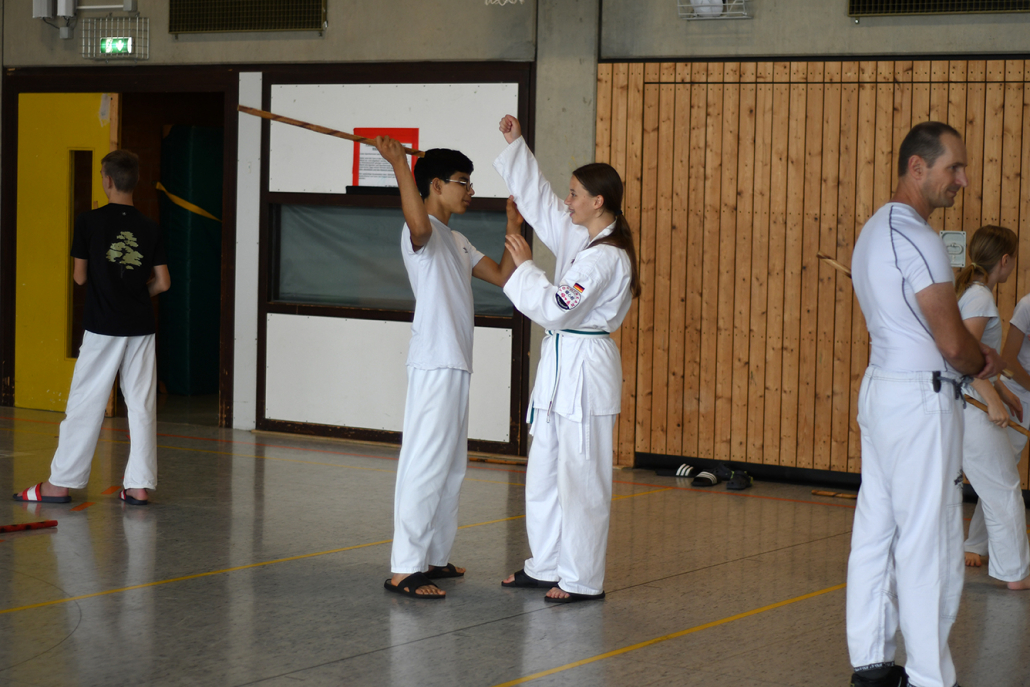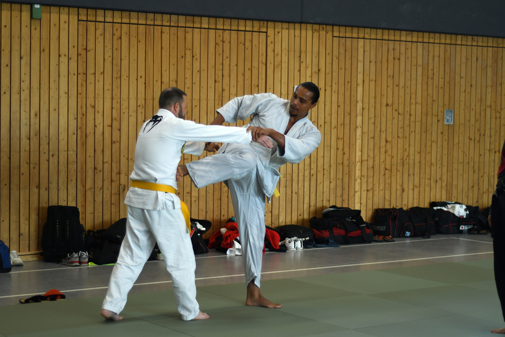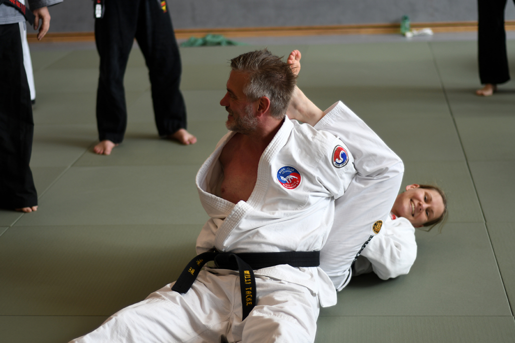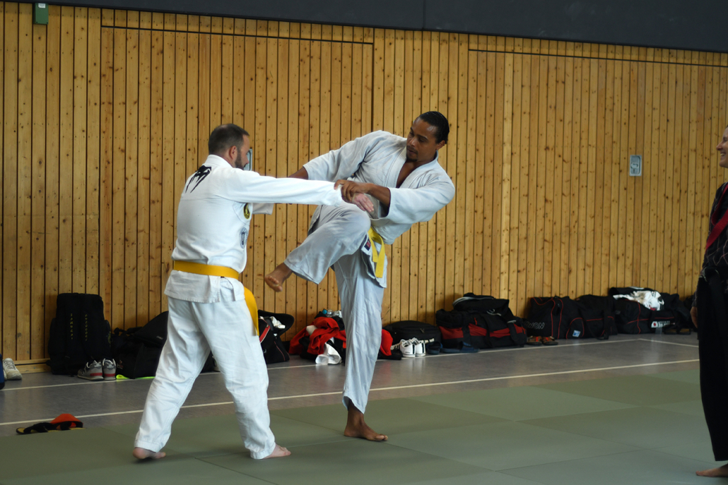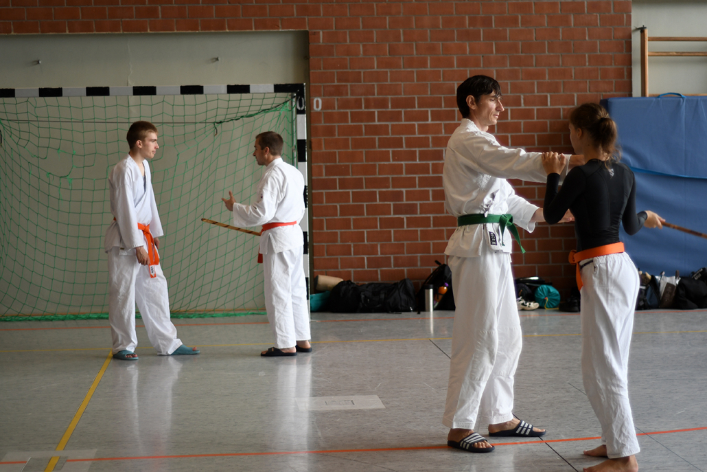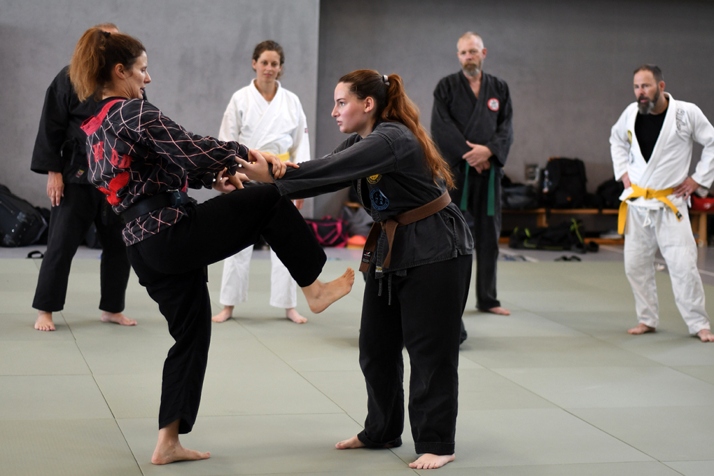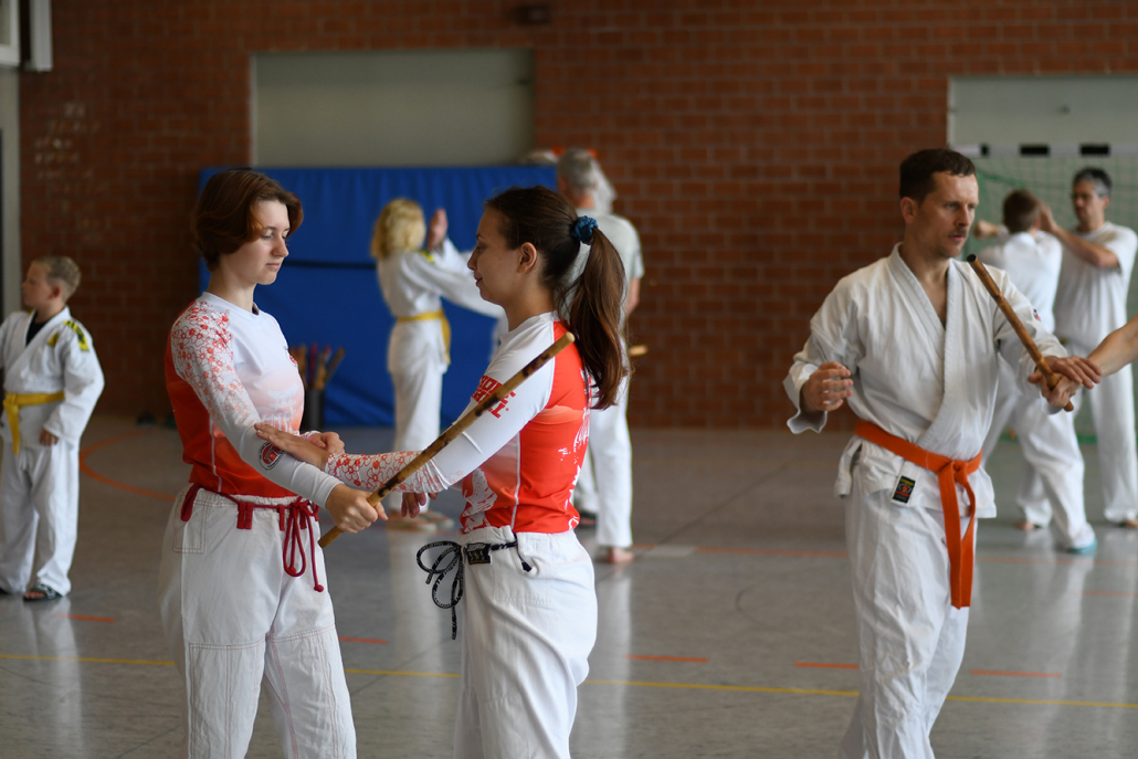 Besonders eindrucksvoll war die Vielfalt der Lehrenden, die mit ihren Hintergründen verschiedene Perspektiven auf das Jiu-Jitsu und verwandte Kampfkünste eröffneten. Achim Hanke, Träger des 9. Dans im Ju Jutsu, vermittelte mit seiner Erfahrung aus mehreren Disziplinen praxisnahe Selbstverteidigung sowohl im Stand als auch am Boden. Alain Sailly aus Frankreich, ebenfalls 9. Dan und Begründer des Goshindo, zeigte fließende Übergänge zwischen waffenlosen Techniken und klassischen Formen des Jiu-Jitsu. Klaus Schmidt, 5. Dan Jiu-Jitsu, brachte Elemente des Modern Arnis in seine Einheiten ein und stellte die Verbindung zwischen traditionellem Training und modernen Bewegungsabläufen her. Janine Poqué, 4. Dan im Hapkido, demonstrierte dynamische Abwehrtechniken mit und ohne Kurzstock, die den Teilnehmenden neue Ansätze für Waffen- und Hebeltechniken eröffneten.
