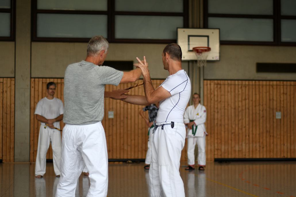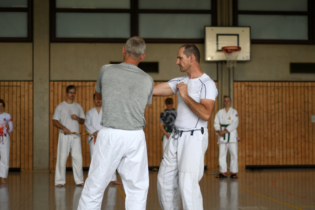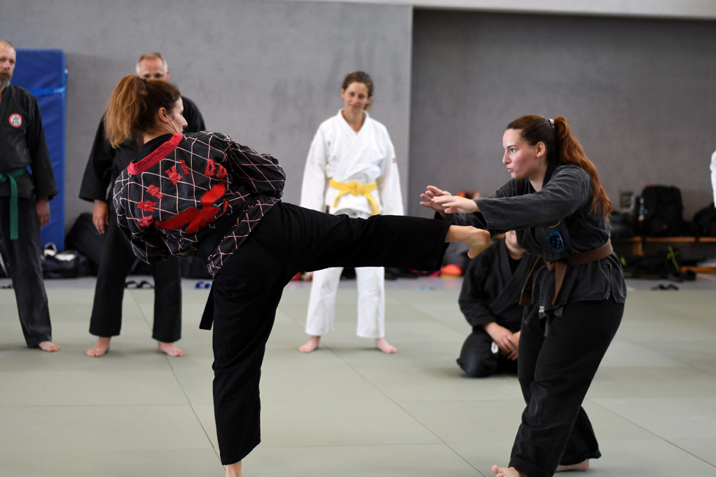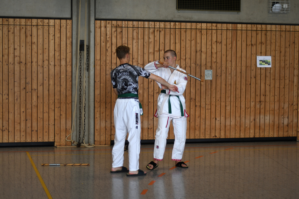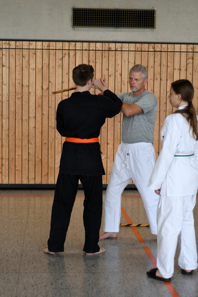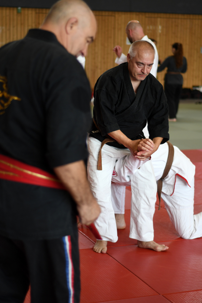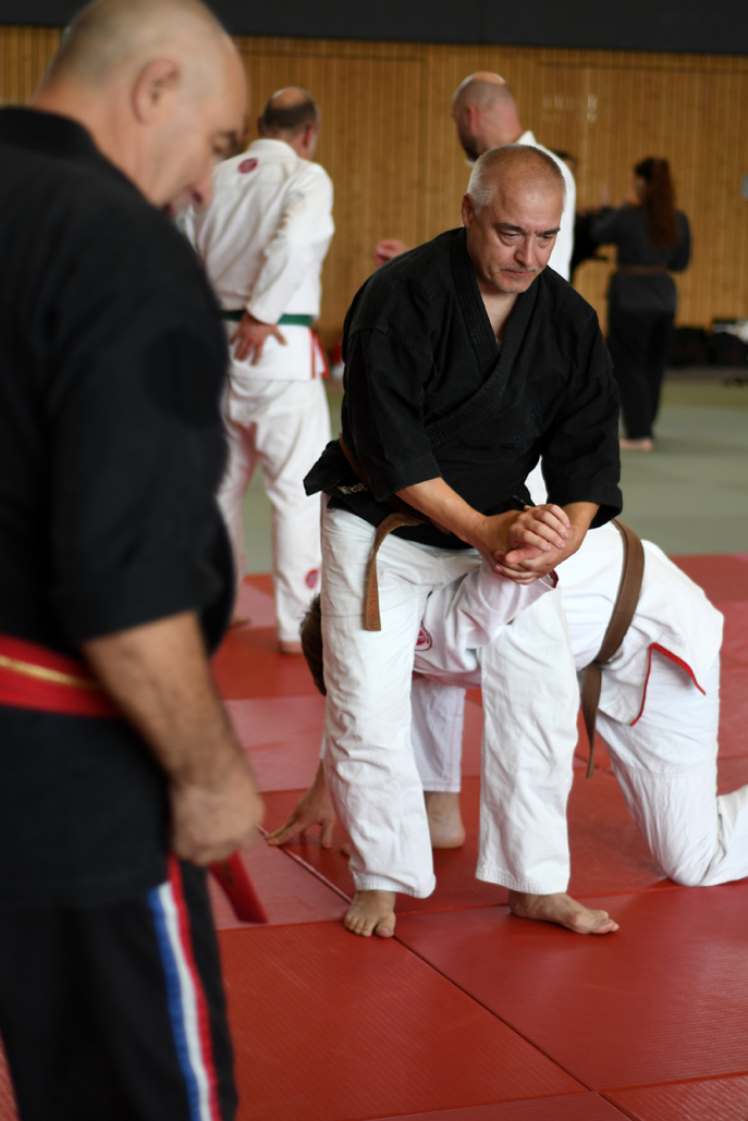 Besonders eindrucksvoll war die Vielfalt der Lehrenden, die mit ihren Hintergründen verschiedene Perspektiven auf das Jiu-Jitsu und verwandte Kampfkünste eröffneten. Achim Hanke, Träger des 9. Dans im Ju Jutsu, vermittelte mit seiner Erfahrung aus mehreren Disziplinen praxisnahe Selbstverteidigung sowohl im Stand als auch am Boden. Alain Sailly aus Frankreich, ebenfalls 9. Dan und Begründer des Goshindo, zeigte fließende Übergänge zwischen waffenlosen Techniken und klassischen Formen des Jiu-Jitsu. Klaus Schmidt, 5. Dan Jiu-Jitsu, brachte Elemente des Modern Arnis in seine Einheiten ein und stellte die Verbindung zwischen traditionellem Training und modernen Bewegungsabläufen her. Janine Poqué, 4. Dan im Hapkido, demonstrierte dynamische Abwehrtechniken mit und ohne Kurzstock, die den Teilnehmenden neue Ansätze für Waffen- und Hebeltechniken eröffneten.