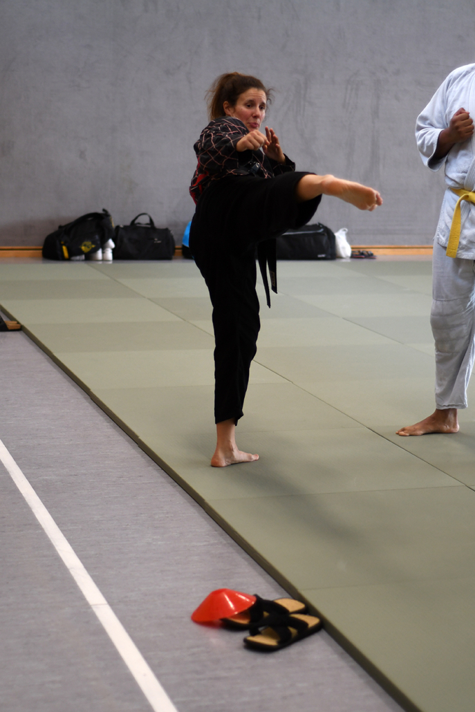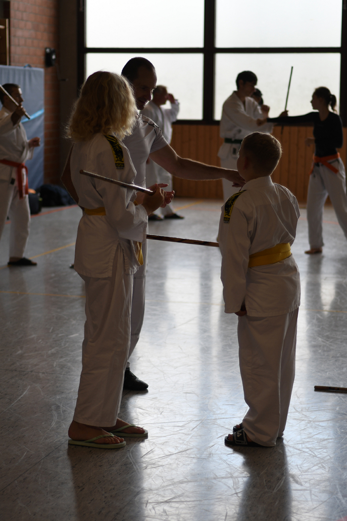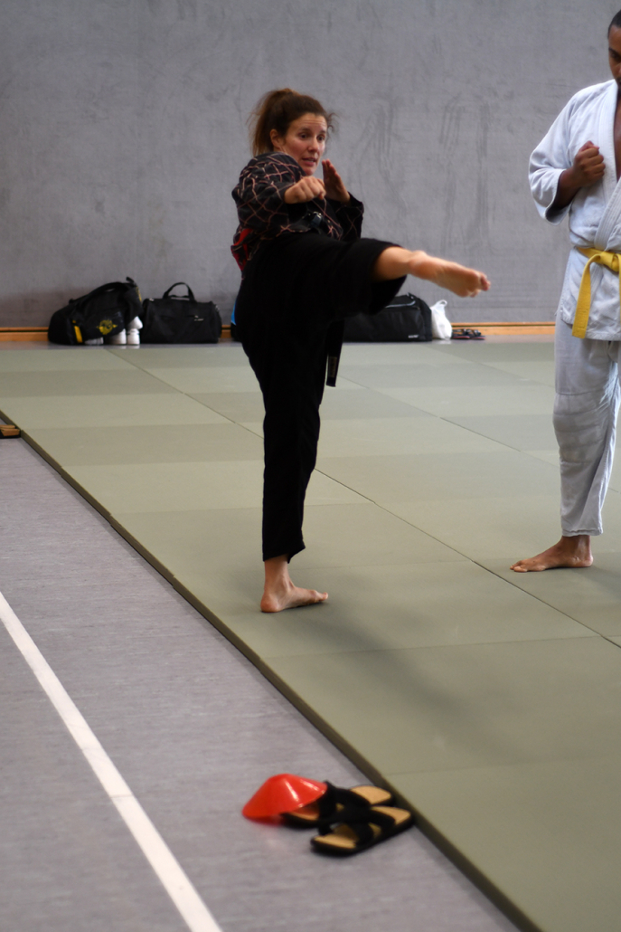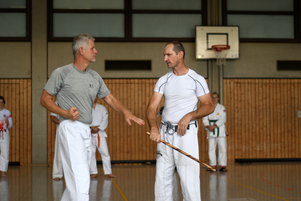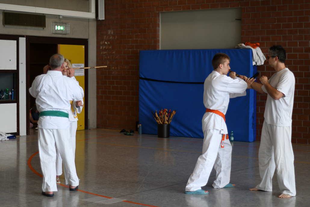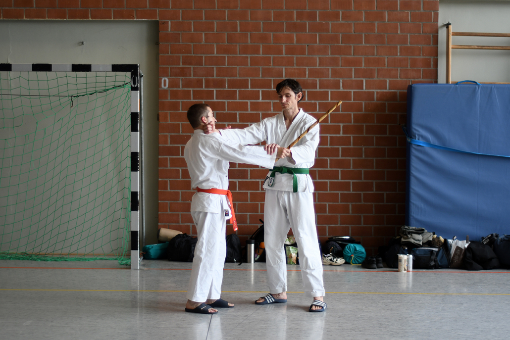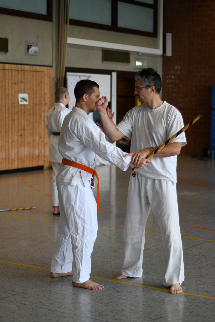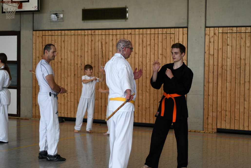 Besonders eindrucksvoll war die Vielfalt der Lehrenden, die mit ihren Hintergründen verschiedene Perspektiven auf das Jiu-Jitsu und verwandte Kampfkünste eröffneten. Achim Hanke, Träger des 9. Dans im Ju Jutsu, vermittelte mit seiner Erfahrung aus mehreren Disziplinen praxisnahe Selbstverteidigung sowohl im Stand als auch am Boden. Alain Sailly aus Frankreich, ebenfalls 9. Dan und Begründer des Goshindo, zeigte fließende Übergänge zwischen waffenlosen Techniken und klassischen Formen des Jiu-Jitsu. Klaus Schmidt, 5. Dan Jiu-Jitsu, brachte Elemente des Modern Arnis in seine Einheiten ein und stellte die Verbindung zwischen traditionellem Training und modernen Bewegungsabläufen her. Janine Poqué, 4. Dan im Hapkido, demonstrierte dynamische Abwehrtechniken mit und ohne Kurzstock, die den Teilnehmenden neue Ansätze für Waffen- und Hebeltechniken eröffneten.