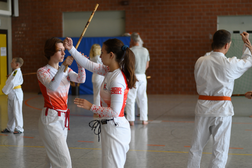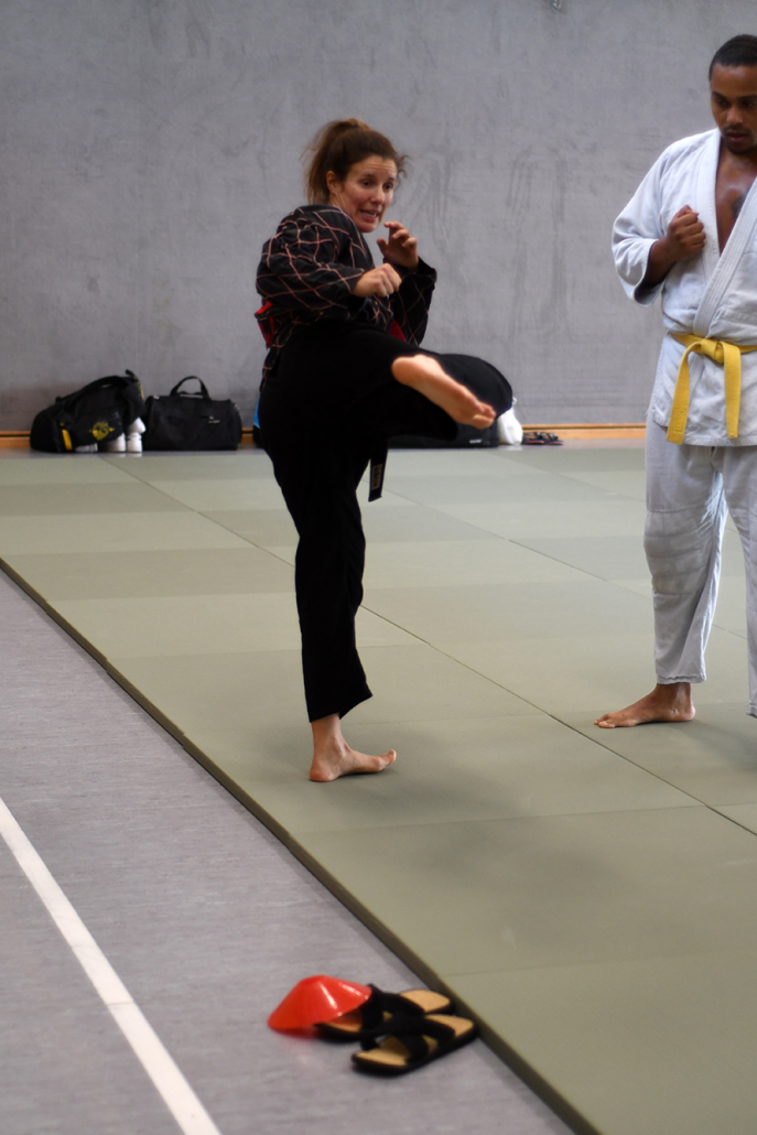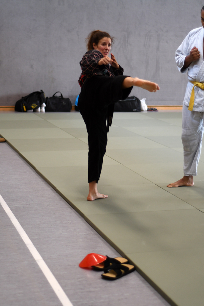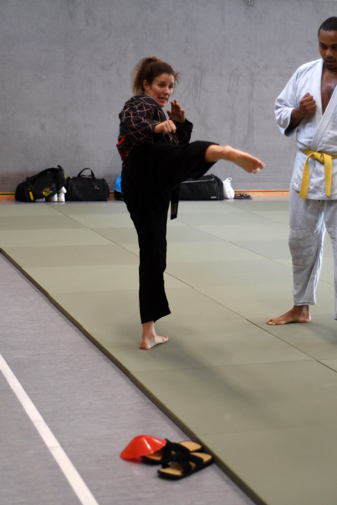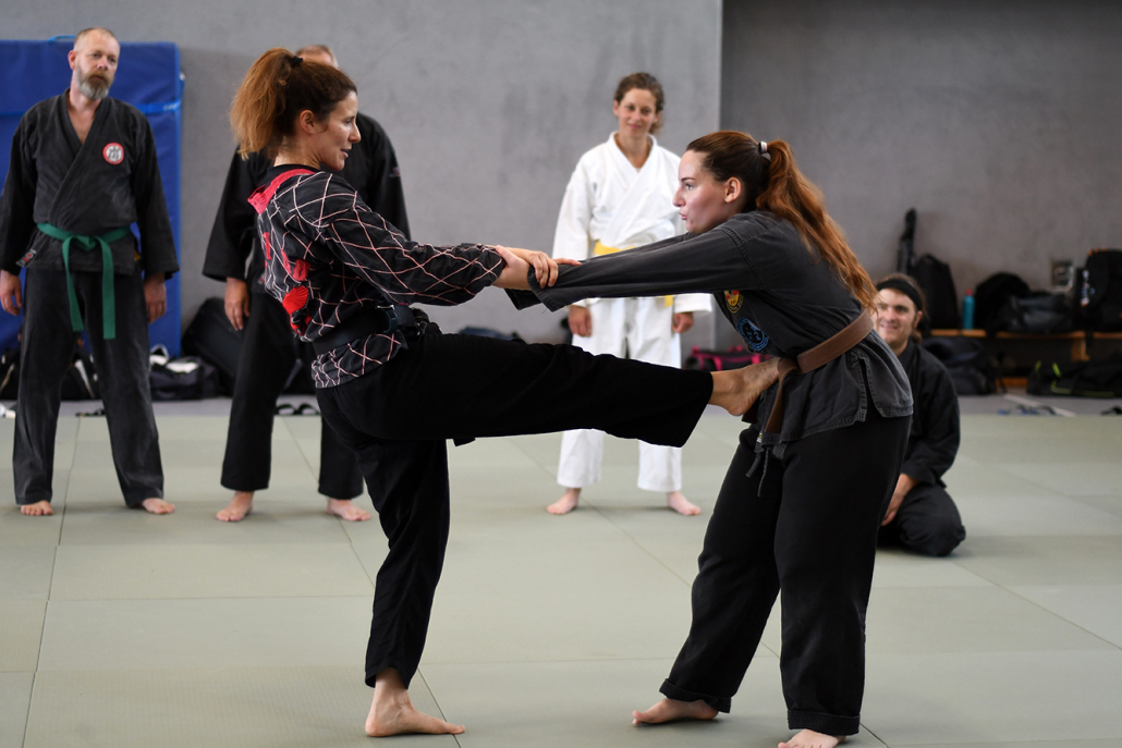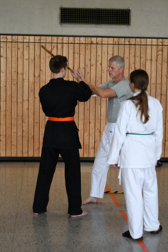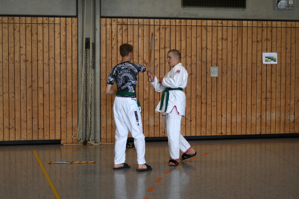 Besonders eindrucksvoll war die Vielfalt der Lehrenden, die mit ihren Hintergründen verschiedene Perspektiven auf das Jiu-Jitsu und verwandte Kampfkünste eröffneten. Achim Hanke, Träger des 9. Dans im Ju Jutsu, vermittelte mit seiner Erfahrung aus mehreren Disziplinen praxisnahe Selbstverteidigung sowohl im Stand als auch am Boden. Alain Sailly aus Frankreich, ebenfalls 9. Dan und Begründer des Goshindo, zeigte fließende Übergänge zwischen waffenlosen Techniken und klassischen Formen des Jiu-Jitsu. Klaus Schmidt, 5. Dan Jiu-Jitsu, brachte Elemente des Modern Arnis in seine Einheiten ein und stellte die Verbindung zwischen traditionellem Training und modernen Bewegungsabläufen her. Janine Poqué, 4. Dan im Hapkido, demonstrierte dynamische Abwehrtechniken mit und ohne Kurzstock, die den Teilnehmenden neue Ansätze für Waffen- und Hebeltechniken eröffneten.